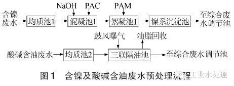 根据实际废水特征和处理要求,工程设计工艺分两步走,第一步,首先对封孔含镍废水及酸碱含油废水进行预处理,具体流程如图1所示。